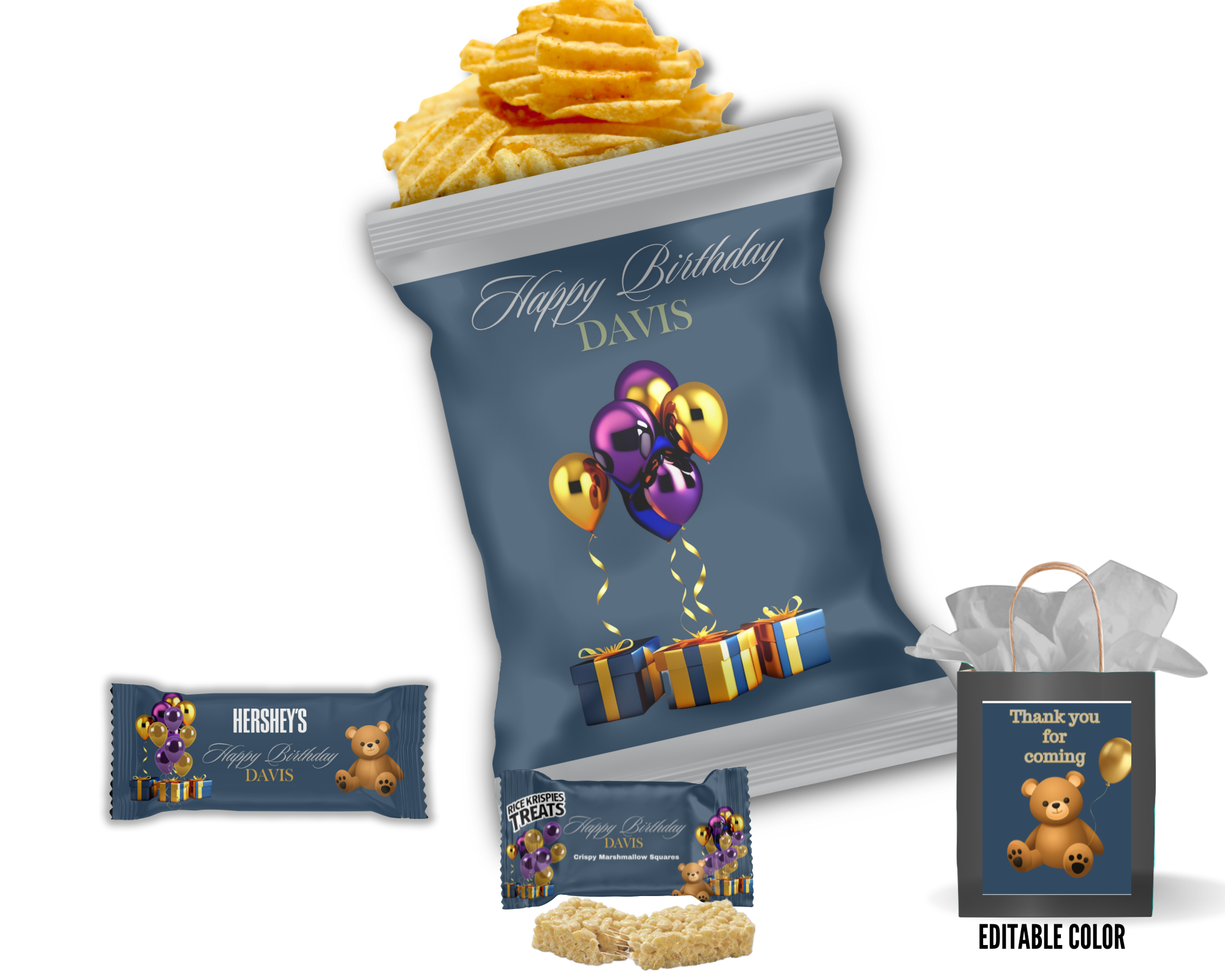 Build your perfect party package! Choose from chip bags, candy bars, bubbles, water bottles, and more — all personalized to match your theme. Mix and match your favorite items to create a one-of-a-kind celebration!